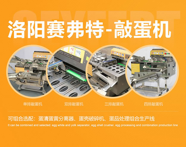 洛陽賽弗特機電科技有限公司成立于2015年,本公司自主研發(fā)生產(chǎn)敲蛋機(單排敲蛋機、雙排敲蛋機、三排敲蛋機、四排敲蛋機等);全自動水中上蛋、洗蛋、烘干、噴碼、噴油、裝托等蛋品處理生產(chǎn)線的各環(huán)節(jié)設(shè)備;蛋清蛋黃分離器、蛋殼破碎機等蛋品處理生產(chǎn)線配套設(shè)備。產(chǎn)品門類齊全、設(shè)備組合配套能力強,深受客戶好評和肯定。